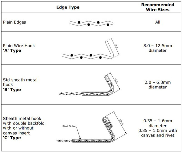 The most efficient heavy screens are fitted with hooked edges to provide for tensioning. Unless otherwise specified, hooked edges for heavy and medium type screen cloths are approximately 32mm long (from the inside of the bend to the end of the hook) and at a 45-60º degree angle from the face of the screen cloth.Lighter screen cloths often use either fold back or fold forward hooks, and are approximately 19mm high with a 13mm fold.